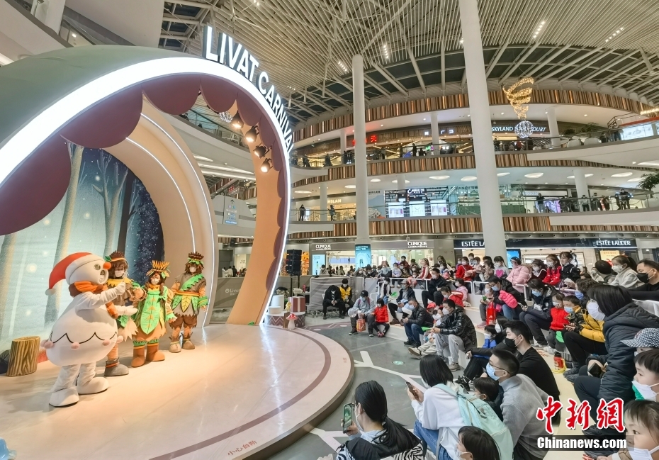 1月2日,眾多市民在北京薈聚中心觀看商場內(nèi)的演出活動。元旦假期,北京各商場人流回升,節(jié)日氛圍濃厚。圖為薈聚中心主中庭演出的原創(chuàng)童話劇《膽小原始人》吸引眾多市民觀看。中新社記者 趙雋 攝