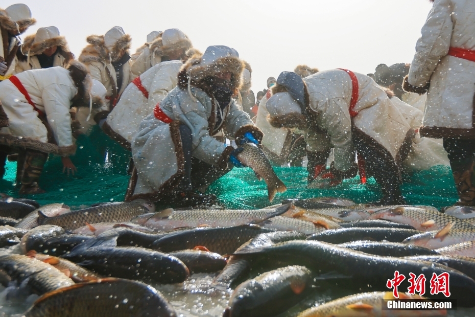漁民在新疆維吾爾自治區(qū)巴音郭楞蒙古自治州博湖縣博斯騰湖冰面上冬捕作業(yè)。中新社發(fā) 年磊 攝 圖片來(lái)源:CNSphoto