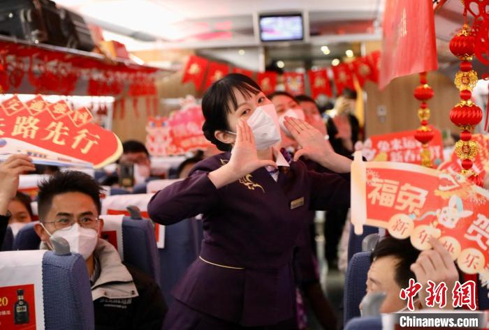 1月21日,合肥南開往北京南的G2552次列車上張燈結(jié)彩,熱鬧非凡。7時04分,隨著列車緩緩駛離站臺,一場別開生面的“列車春晚”在車廂內(nèi)拉開帷幕。趣味問答《列車上的那些事兒》、舞蹈《春風(fēng)十里報新年》、合唱《相親相愛》等精彩節(jié)目依次上演,讓旅客在返鄉(xiāng)團圓的旅途中感受到濃濃的年味。梁浩然 攝