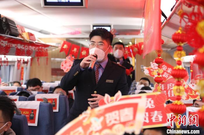 在合肥南開往北京南的G2552次列車上,乘務(wù)員為返鄉(xiāng)乘客獻(xiàn)出一場別開生面的“列車春晚”!『戏 攝