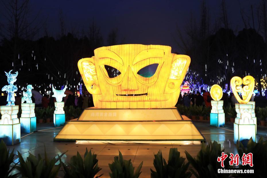 1月25日晚,成都金沙遺址博物館園區(qū)內(nèi),以“春暖花開(kāi)·金兔送!睘橹黝}的18組大型主題彩燈營(yíng)造出濃濃的新春氣氛,吸引游人參觀。 中新社記者 王磊 攝