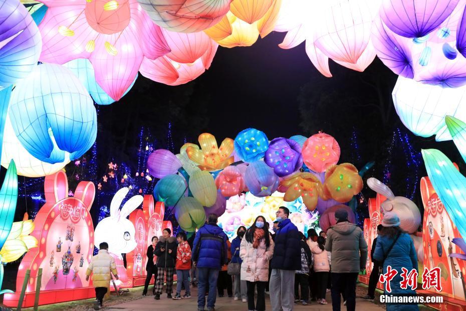 1月25日晚,成都金沙遺址博物館園區(qū)內(nèi),以“春暖花開·金兔送!睘橹黝}的18組大型主題彩燈營造出濃濃的新春氣氛,吸引游人參觀。 中新社記者 王磊 攝