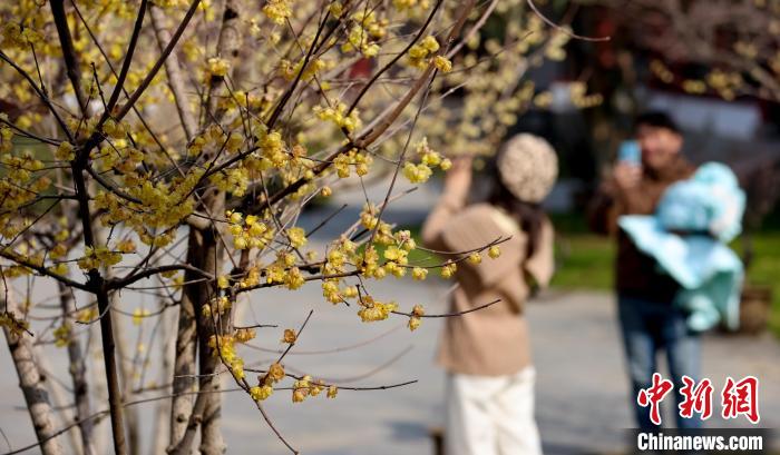 圖為游客在盛開的臘梅樹下拍攝留影 張暢 攝