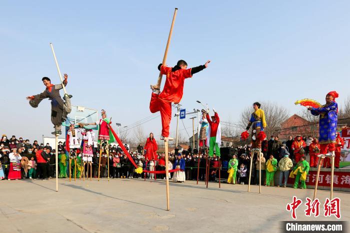 山東省淄博市淄川區(qū)西河鎮(zhèn)海廟村文化廣場(chǎng),村民在表演高蹺。 翟慎安 攝