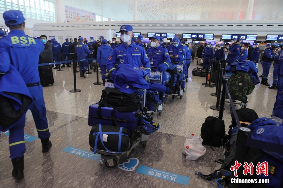 2月8日,救援隊員們在武漢天河機場候機樓等待登機。當(dāng)日,來自湖北、安徽、四川、廣東、浙江等中國十余省市的藍天救援隊隊員在湖北武漢集結(jié),于當(dāng)晚乘機前往土耳其伊斯坦布爾,參與地震災(zāi)區(qū)救援工作。中新社記者 張暢 攝