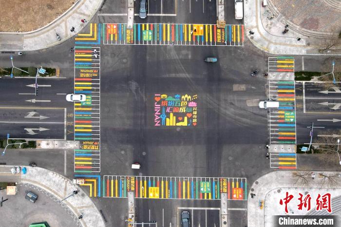在路口的中間是一幅“繽紛五色,匯聚成章”的主題圖案。體現(xiàn)泉城濟(jì)南“山、城、泉、河、湖”主體元素和“大、強(qiáng)、美、富、通”美好愿景。路口的醒目標(biāo)語(yǔ)“我愛(ài)濟(jì)南”“有你在,我安心”“幸福路,慢慢走”,體現(xiàn)了一個(gè)城市和市民寬廣包容的胸襟和“我心安處是家鄉(xiāng)”的溫暖情懷。(無(wú)人機(jī)照片) 崔健 攝