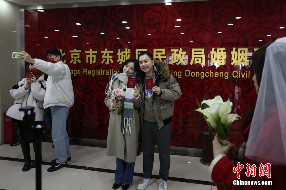 2月14日,在北京市東城區(qū)民政局婚姻登記處,不少新人前來登記結(jié)婚。圖為新人領(lǐng)取結(jié)婚證后拍照留念。中新社記者 蔣啟明 攝