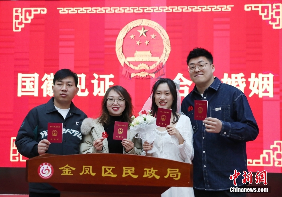 2月14日,寧夏銀川市金鳳區(qū)民政局婚姻登記處,新人領(lǐng)取結(jié)婚證后拍照留念。當(dāng)日,不少新人前來(lái)登記結(jié)婚。中新社記者 于晶 攝