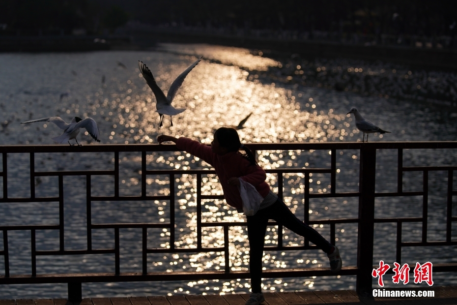 3月5日,小女孩在河邊喂鷗。進(jìn)入3月份,云南昆明天氣逐漸變暖,越冬的紅嘴鷗即將飛離當(dāng)?shù)亍2簧偈忻裰苣﹣?lái)到大觀河邊觀鷗喂鷗,送別“春城”的老朋友,期待和它們冬天再相聚。 中新社記者 劉冉陽(yáng) 攝