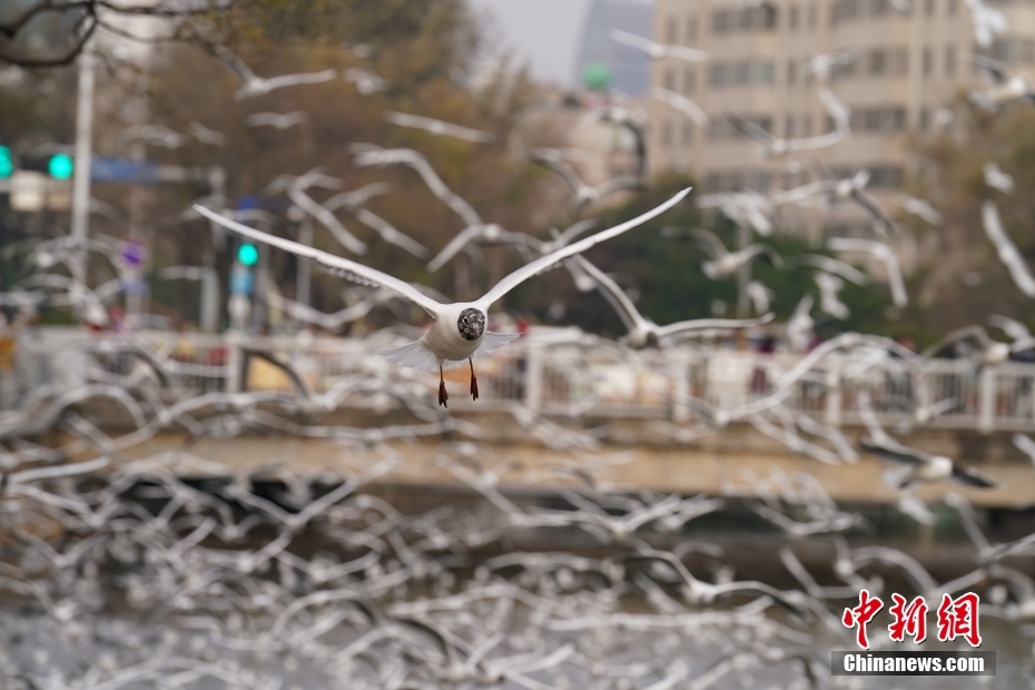 3月5日,大觀河上翱翔的紅嘴鷗。進入3月份,云南昆明天氣逐漸變暖,越冬的紅嘴鷗即將飛離當?shù)。不少市民周末來到大觀河邊觀鷗喂鷗,送別“春城”的老朋友,期待和它們冬天再相聚。中新社記者 劉冉陽 攝