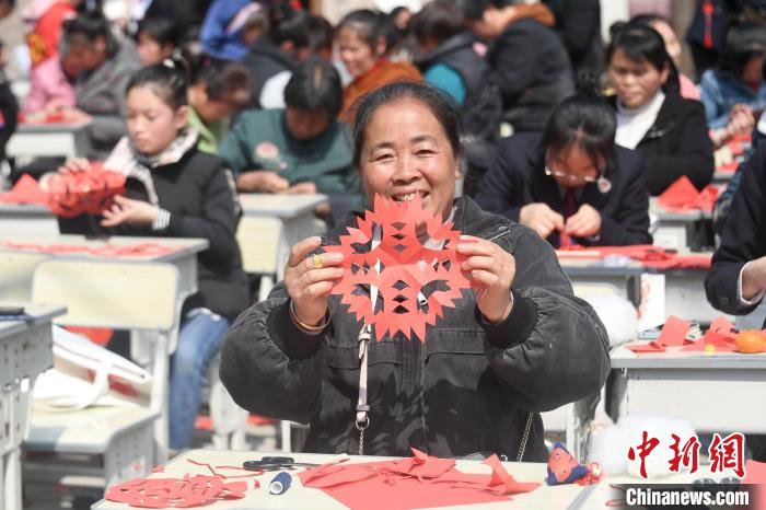 圖為當(dāng)?shù)貗D女同胞在展示自己的剪紙作品!×喂飧 攝