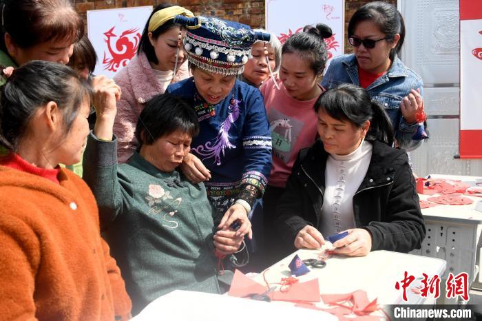 仫佬族剪紙藝人羅華清指導當?shù)貗D女進行剪紙文創(chuàng)作品制作!×喂飧 攝