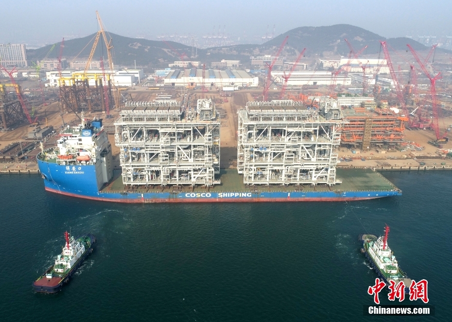 3月10日,全球首例一體化建造LNG模塊化工廠從青島西海岸新區(qū)啟運加拿大。圖/CNSphoto 張進(jìn)剛 攝