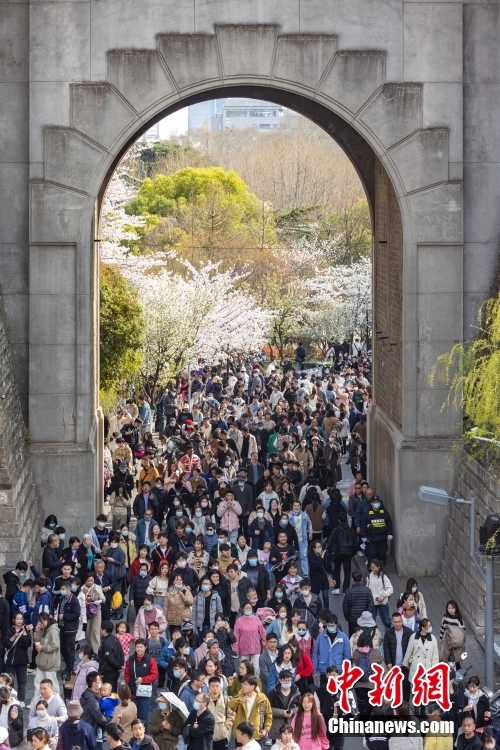 3月19日,江蘇南京,明城墻解放門內(nèi)外的櫻花盛開,吸引眾多游人前來,踏青游玩盡享春光。中新社記者 泱波 攝