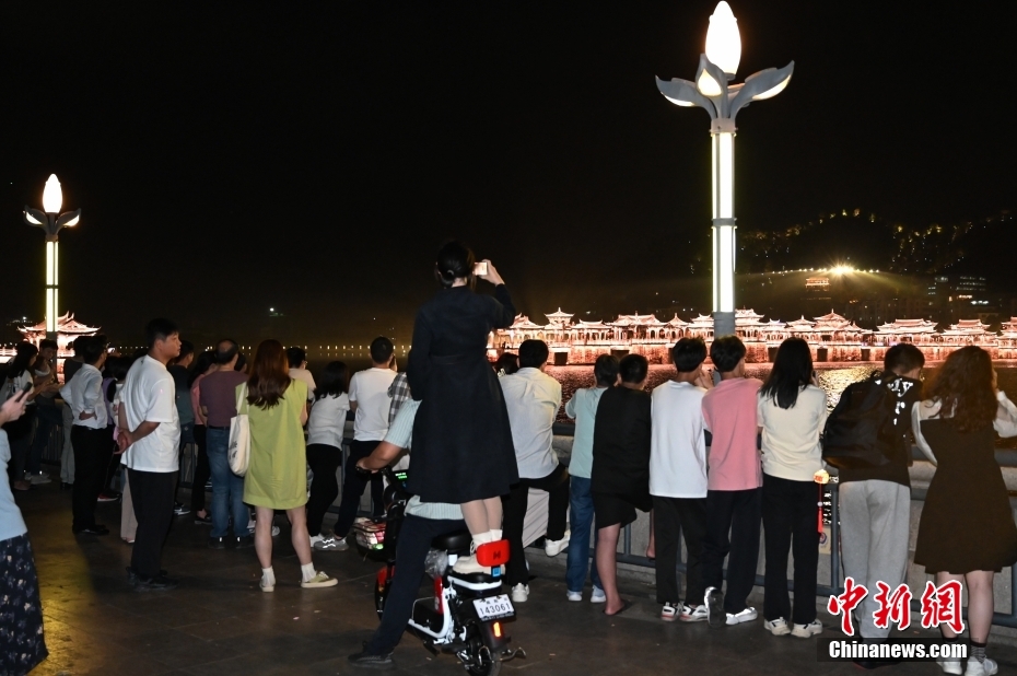 5月3日,廣東潮州廣濟(jì)橋燈光秀吸引游客。中新社記者 陳楚紅 攝