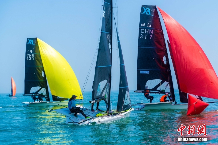 5月12日,49erFX級項目參賽選手在比賽中。當日,為期8天的2023年全國帆船冠軍賽(49er級&49erFX級&諾卡拉17級)在青島奧林匹克帆船中心開賽,這是該賽事首次在青島舉辦。中新社發(fā) 臧魯敏 攝