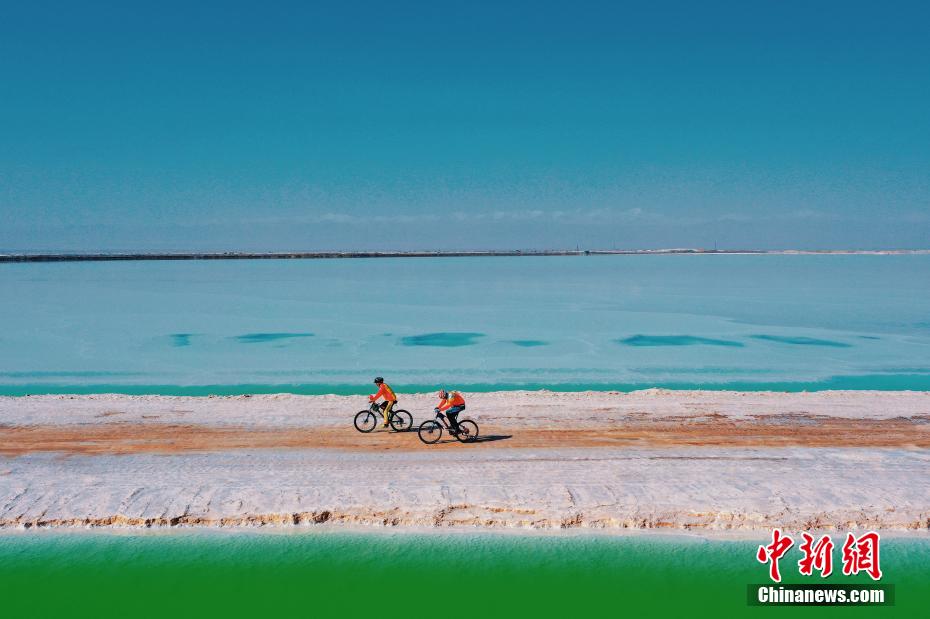 圖為騎手在茫崖翡翠湖騎行。賈海元 攝