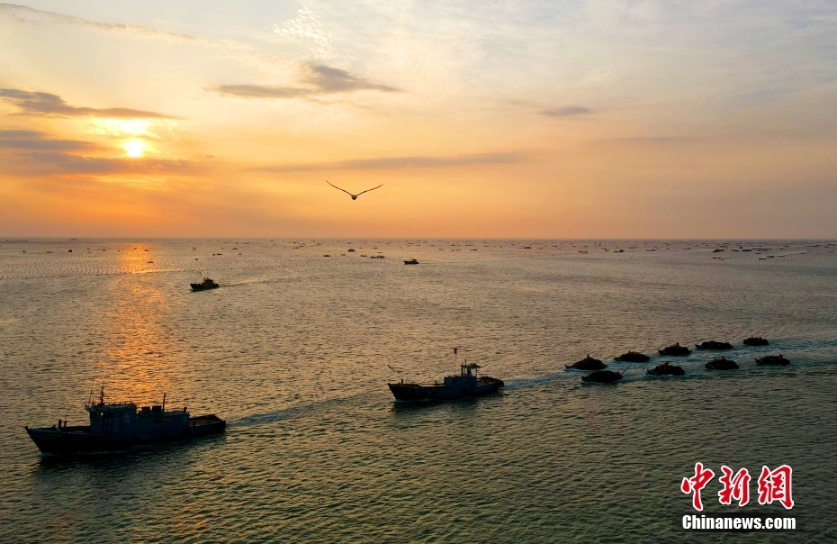 6月5日,山東省榮成市愛(ài)倫灣海洋牧場(chǎng),蔚藍(lán)的海上日出絢爛多彩,漁民披著朝霞駕船收獲海帶,海上一派生機(jī)盎然的繁忙景象。近年來(lái),榮成市大力推廣科技興海,開(kāi)發(fā)海洋,更重視保護(hù)海洋生態(tài)環(huán)境,積極探索“淺海多營(yíng)養(yǎng)層次生態(tài)養(yǎng)殖模式”,生態(tài)養(yǎng)殖成為朝陽(yáng)產(chǎn)業(yè),面積逐年增加,綜合效益明顯增長(zhǎng)。CNSphoto 楊志禮 攝