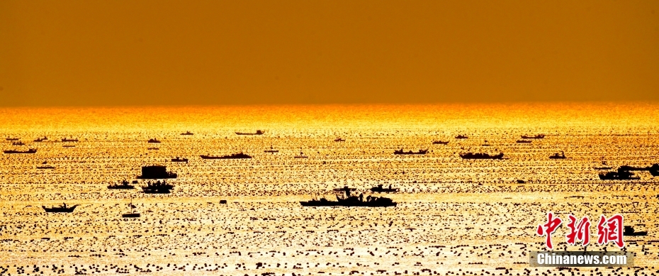 6月5日,山東省榮成市愛倫灣海洋牧場,漁民披著朝霞駕船收獲海帶。CNSphoto 楊志禮 攝