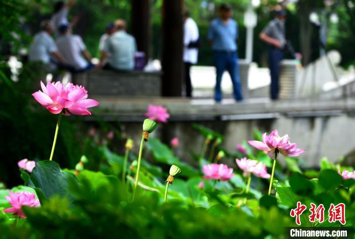 福州茶亭公園盛開的荷花吸引市民前來觀賞。 張斌 攝