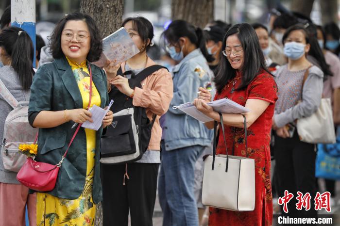 在山東泰安,帶隊(duì)老師身穿旗袍在泰安二中考點(diǎn)外為考生加油。 陳陽(yáng) 攝