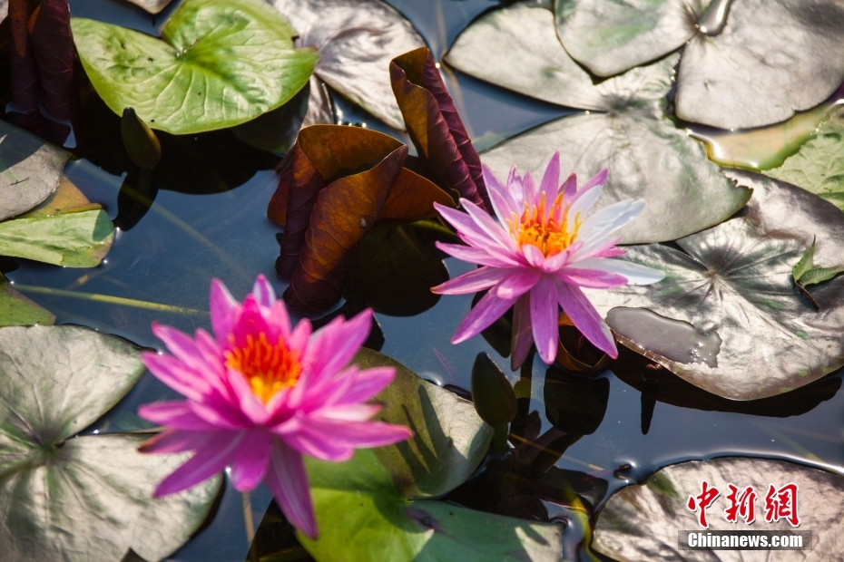 6月15日,在南京玄武湖公園拍攝的雙色睡蓮(右)。這株由紫紅色和純白色組成的“雙色睡蓮”色彩獨(dú)特,吸引不少游客駐足觀賞。圖/CNSphoto 孫忠南 攝