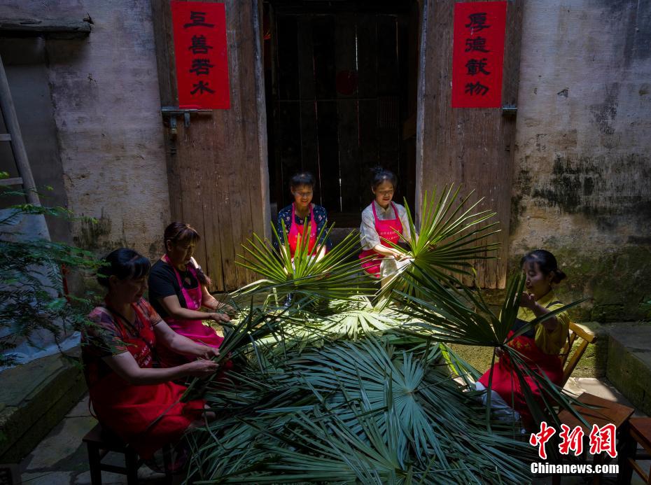 端午節(jié)臨近,在安徽寧國千年古鎮(zhèn)胡樂老街,村民用上山采摘的粽葉和粽櫚繩,包當(dāng)?shù)靥厣眍^粽。葉四清 攝