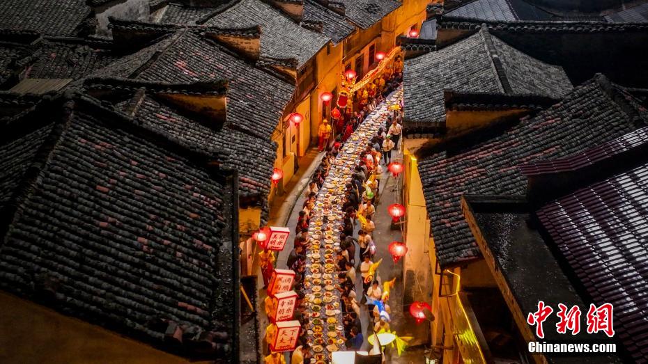 端午節(jié)臨近,安徽寧國千年古鎮(zhèn)胡樂老街上,游客參加長(zhǎng)桌宴,和村民一起分享端午美食。李曉紅 攝