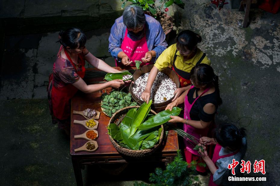 端午節(jié)臨近,在安徽寧國千年古鎮(zhèn)胡樂老街,村民用上山采摘的粽葉和粽櫚繩,包當(dāng)?shù)靥厣眍^粽。葉四清 攝