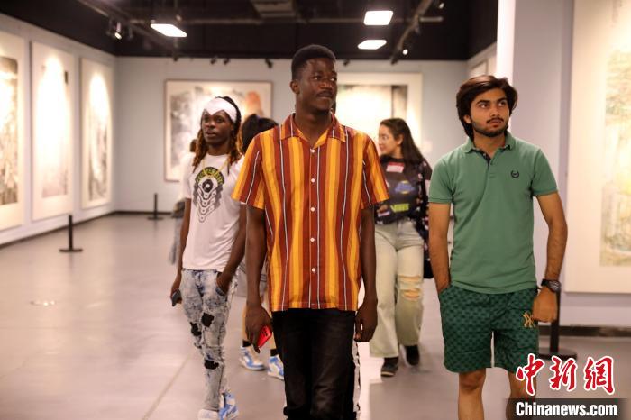 留學(xué)生們?cè)谂R沂美術(shù)館參觀中國(guó)畫(huà)和書(shū)法作品!O磊 攝