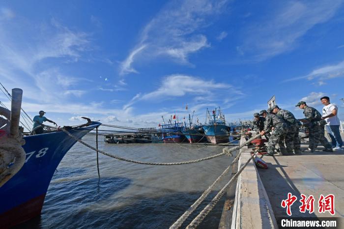 在福建省泉州市泉港區(qū)峰尾鎮(zhèn)誠峰國家一級漁港,幾名退伍軍人正在幫助漁民緊固漁船纜繩!×趾霔v 攝