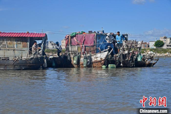 海上作業(yè)漁民正在緊固作業(yè)船只!×趾霔v 攝