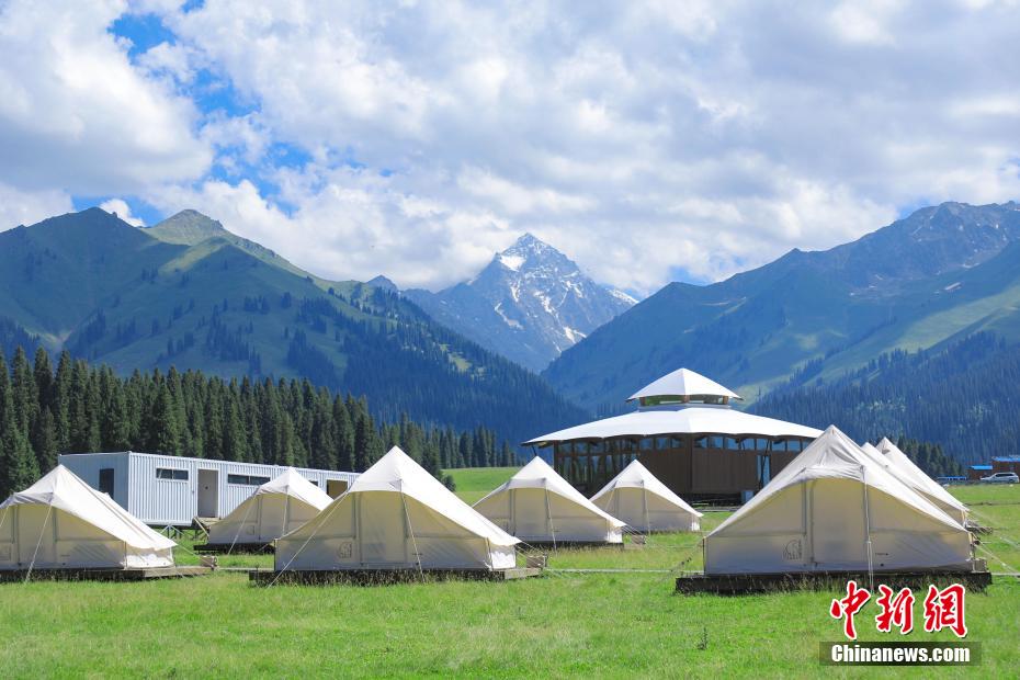 藍(lán)天雪山草原與氈房構(gòu)成一幅美麗畫卷。鞏留縣融媒體中心 供圖