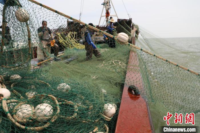 8月2日,山東省濱州市無(wú)棣縣渤海灣,當(dāng)?shù)貪O民正在忙著捕撈海蜇。 高士東 攝
