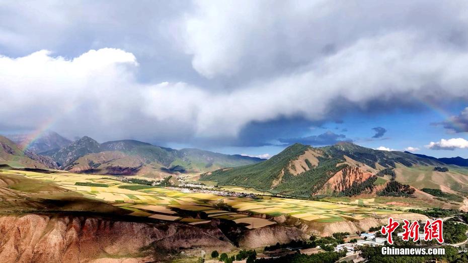 秋日,在位于祁連山腹地的青海省海北藏族自治州祁連縣境內(nèi),田野里的青稞、小麥顆粒飽滿。從空中俯瞰,金色的田野、綠色的草原、連綿的山巒交相輝映,宛若一幅“大地油畫”,游客在田間或是漫步,或是起舞。海北州祁連縣地處祁連山中段腹地,農(nóng)作物以青稞和油菜籽為主,到九月底這里將迎來牛羊出欄、農(nóng)作物收割的豐收季。圖為祁連山腹地田野色彩斑斕。 楊春麗 攝