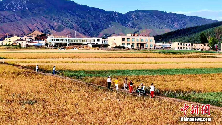 秋日,在位于祁連山腹地的青海省海北藏族自治州祁連縣境內(nèi),田野里的青稞、小麥顆粒飽滿。從空中俯瞰,金色的田野、綠色的草原、連綿的山巒交相輝映,宛若一幅“大地油畫”,游客在田間或是漫步,或是起舞。海北州祁連縣地處祁連山中段腹地,農(nóng)作物以青稞和油菜籽為主,到九月底這里將迎來牛羊出欄、農(nóng)作物收割的豐收季。圖為祁連山腹地田野色彩斑斕。 楊春麗 攝