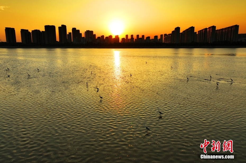 9月4日,山東省青島市城陽區(qū)流亭街道墨水河入?跐竦,成群蒼鷺在霞光中覓食棲息。圖/CNSphoto 王海濱 攝