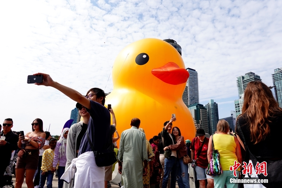 當(dāng)?shù)貢r(shí)間9月17日,加拿大多倫多,世界最大橡皮鴨出現(xiàn)在安大略湖湖濱,吸引游人前來(lái)參觀。這只重約13.6噸、約6層樓高的巨大橡皮鴨是2023年多倫多湖濱節(jié)的最大亮點(diǎn)。中新社記者 余瑞冬 攝