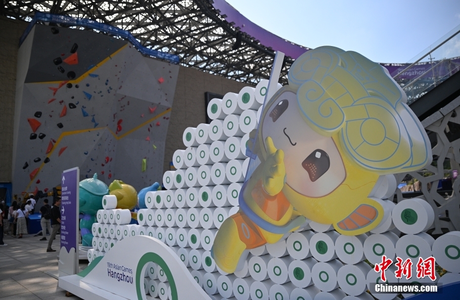 9月17日,羊山攀巖中心外展示著杭州亞運會吉祥物的攀巖形象。浙江紹興柯橋羊山攀巖中心所在地曾是廢棄采石場,如今已蝶變?yōu)楹贾輥嗊\會攀巖項目的比賽場館,并將產(chǎn)生6枚金牌。