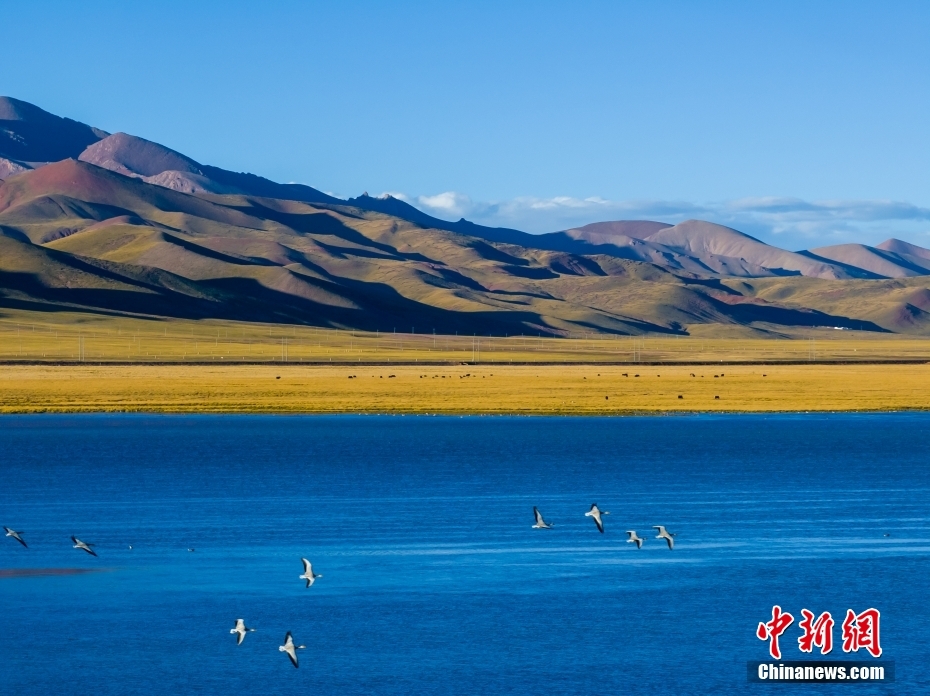 9月25日,西藏那曲措那風(fēng)景如畫,吸引了黑頸鶴、天鵝等眾多鳥(niǎo)類在此棲息。圖為鳥(niǎo)兒在水中嬉戲。圖/CNSphoto 黃倫斌 攝