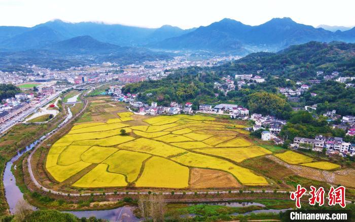 航拍安徽省安慶市岳西縣溫泉鎮(zhèn)解放村秋景。 吳均奇 攝