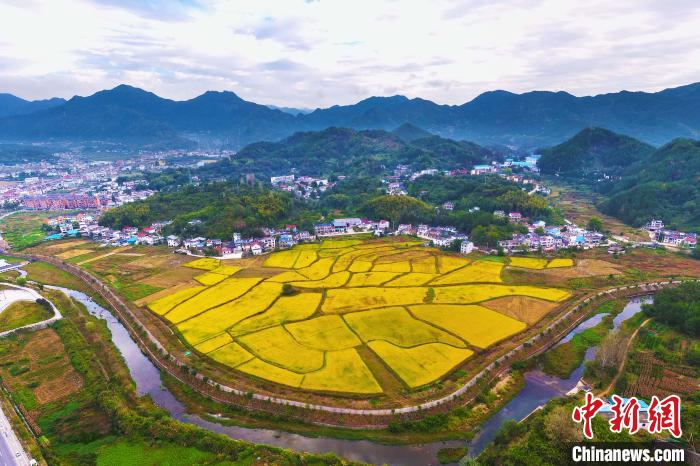 航拍安徽省安慶市岳西縣溫泉鎮(zhèn)解放村秋景。 吳均奇 攝