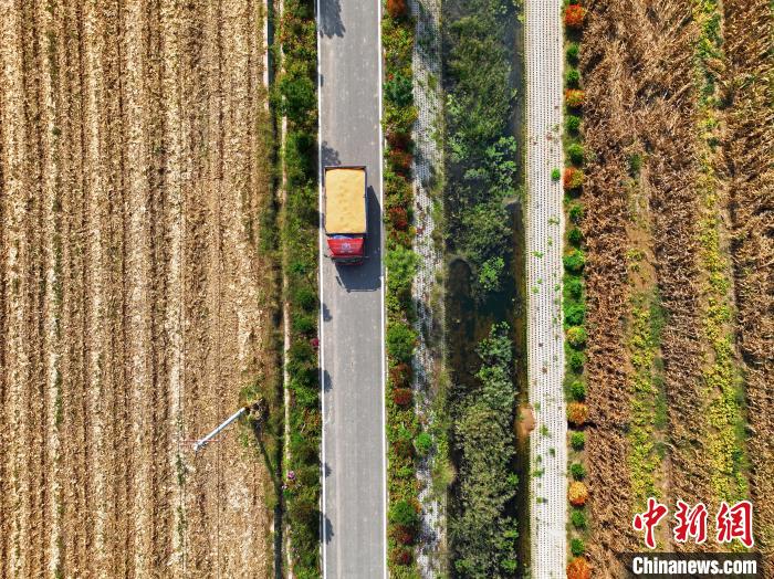 圖為金黃的玉米裝滿車輛拉運(yùn)(無人機(jī)圖片)。厲佳 攝