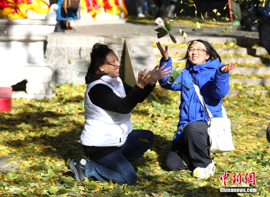 11月6日,游客在北京潭柘寺內(nèi)賞玩飄落的銀杏葉。眼下,京西潭柘寺景區(qū)進(jìn)入最美的季節(jié),潭柘寺景區(qū)一年一度的銀杏節(jié)活動——“潮拓里-杏運(yùn)園游會”成為市民金秋賞葉打卡的好去處。中新社記者 趙雋 攝