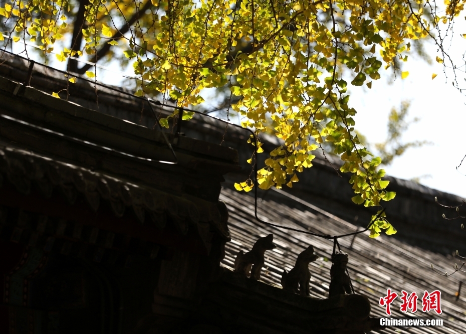 11月6日,北京潭柘寺銀杏葉與屋檐神獸相襯美如畫。眼下,京西潭柘寺景區(qū)進入最美的季節(jié),潭柘寺景區(qū)一年一度的銀杏節(jié)活動——“潮拓里-杏運園游會”成為市民金秋賞葉打卡的好去處。中新社記者 趙雋 攝