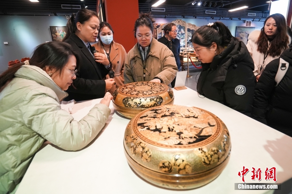 11月29日,“江山如畫”網(wǎng)上主題宣傳活動(山西)采訪團走進山西省晉中市平遙古城,在唐都漆器博物館參觀欣賞推光漆器作品。中新社記者 武俊杰 攝