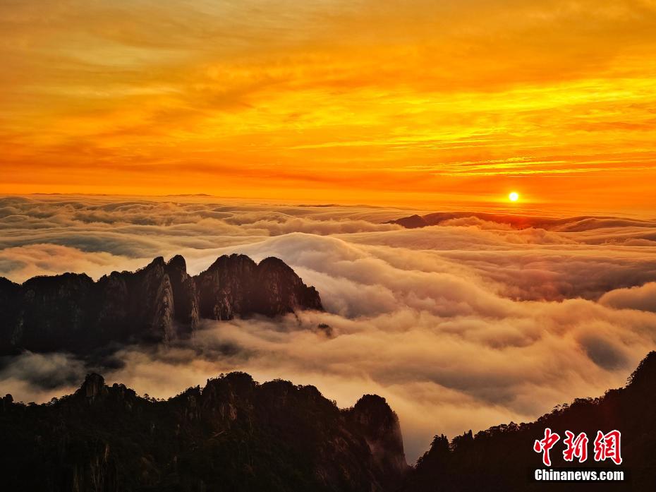 遠(yuǎn)看天邊,縹緲云霧時(shí)而濃厚,時(shí)而輕薄。放眼山間,千峰萬壑在升騰起伏的云海中若隱若現(xiàn),大如孤島,中如盆景,小如鐘乳,飄忽不定。圖為黃山云海霞光匯聚,景象壯觀。解傳光 攝