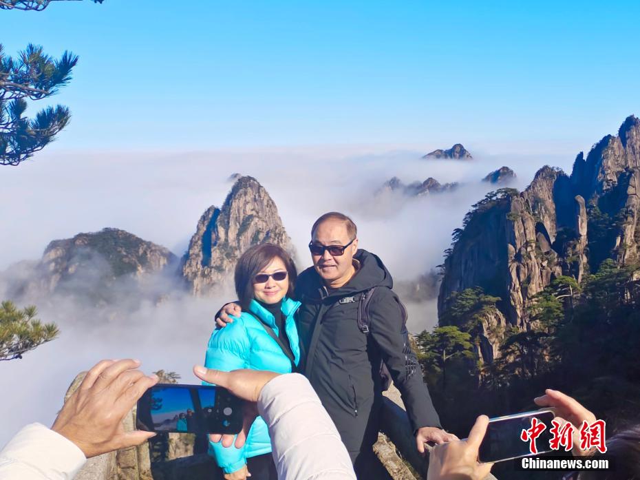 藍(lán)天、墨松、潔云、金光、褐石匯成“淡妝濃抹”的冬日美畫。黃昏時(shí)分,在山巔看夕陽緩緩下沉,遠(yuǎn)山靜悄如畫,天空染成一片金黃,日落美景被小心收藏。隨著光線漸弱,天空顏色開始發(fā)生神奇變化,從金黃漸變?yōu)榉鄢龋俚缴罴t和淺紫,最后是一片柔藍(lán),給游人留下無限遐想。圖為游客在云海前拍照留念。許永杰 攝