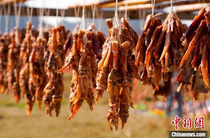 正在晾曬的板鴨“捆綁鴨腳”。楊宗盛 攝