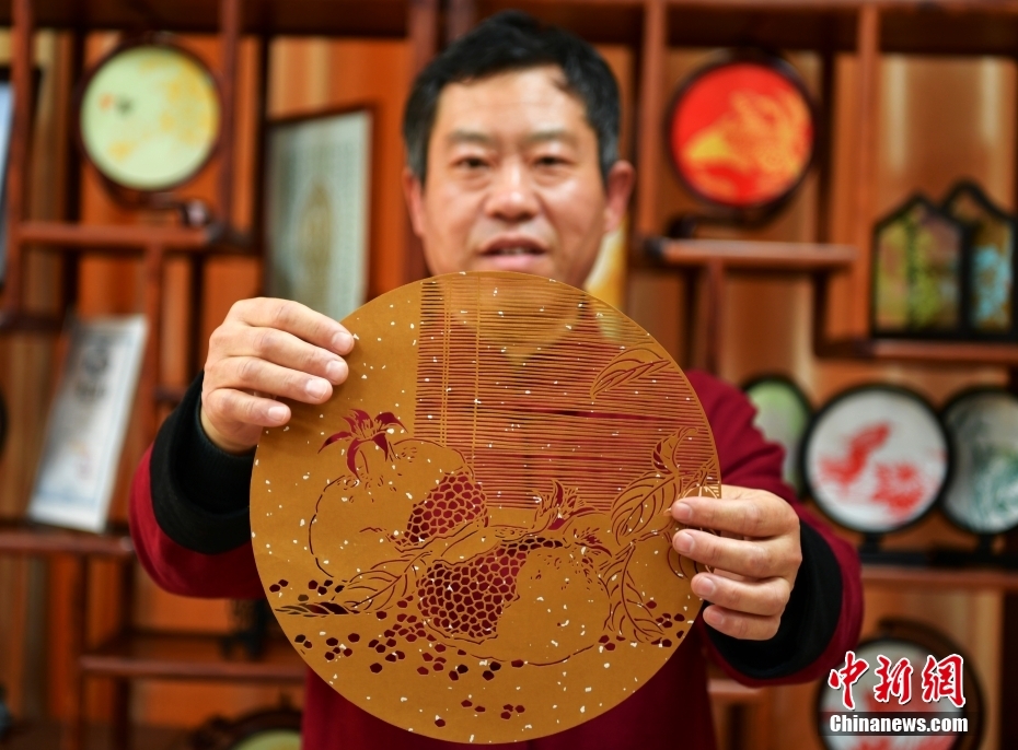 12月28日,河北省衡水市阜城縣,剪紙藝人劉建國展示剛完成的剪紙作品。據了解,阜城剪紙至今已有200多年歷史,2016年被列入河北省省級非物質文化遺產名錄。該技藝具有陰陽相間、線條流暢、色彩單純、形象鮮明、刀工巧妙等藝術風格,它以傳統(tǒng)的中國繪畫為基礎,材料有絲綢、布匹、絹紙、宣紙等。如今,阜城剪紙作品不僅暢銷北京、天津、東北三省,還遠銷新加坡、韓國等28個國家和地區(qū)。中新社記者 翟羽佳 攝